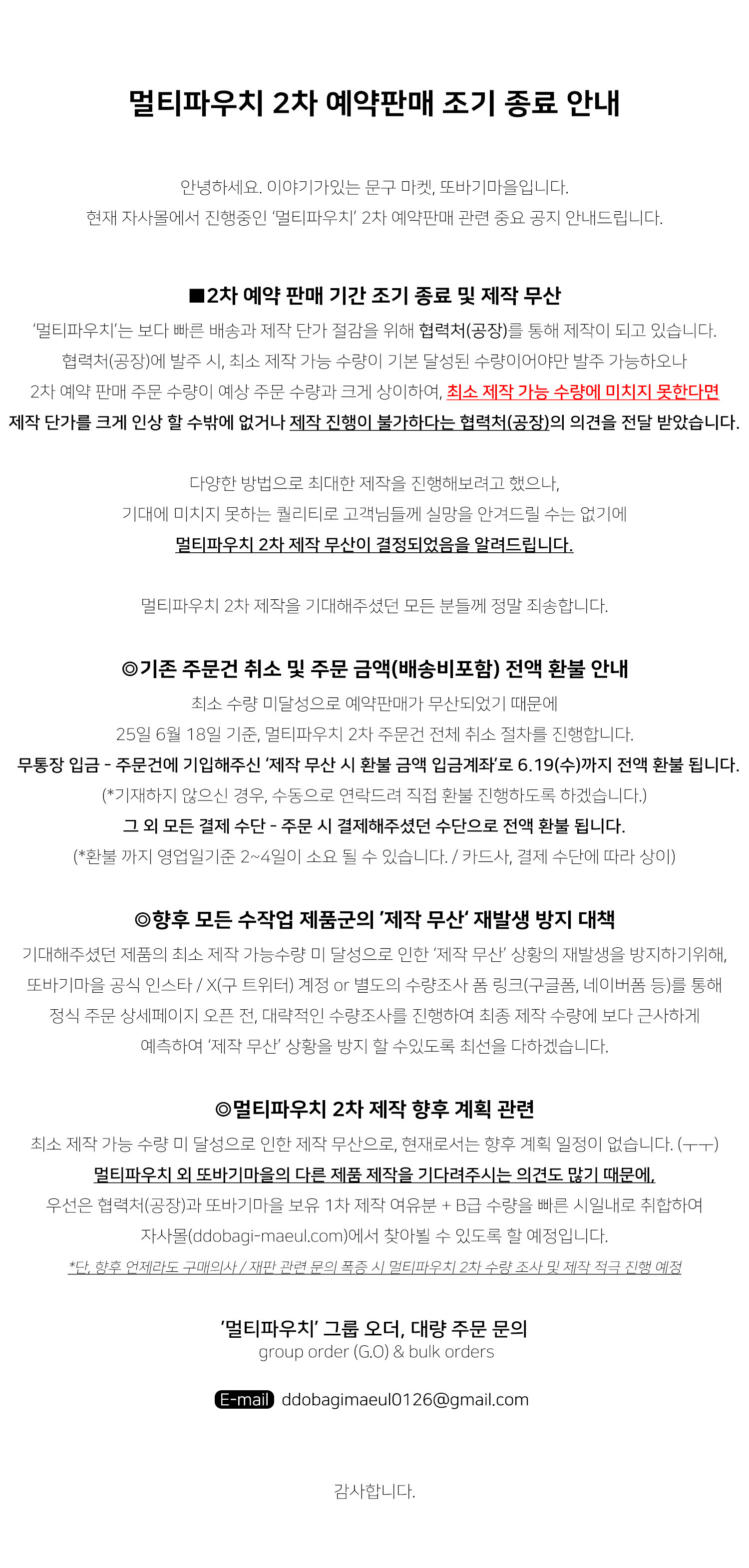 멀티파우치 2차 제작 무산이 결정되었음을 알려드립니다.