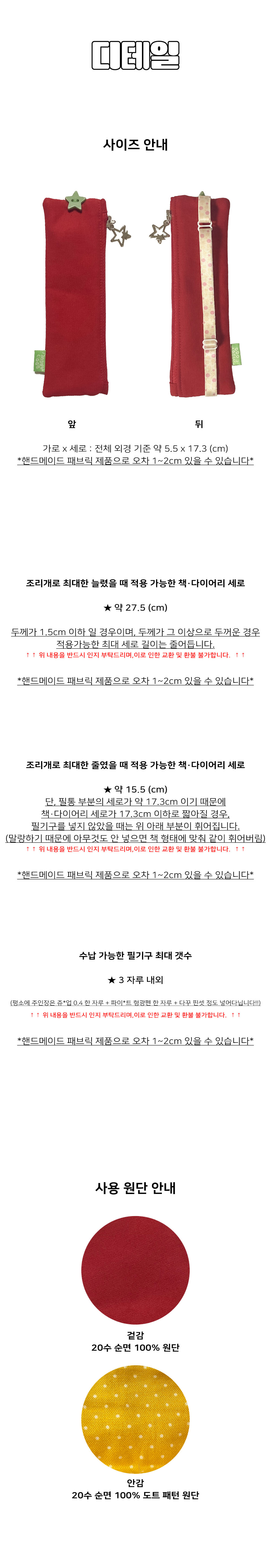 - 1:1 주문 제작(예약 판매) 상품은 고객님 한 분 한 분의 주문 내용에 따라 재료(ex.원단, 부자재 등) 구입과 전체 수작업(핸드메이드)으로 진행되기 때문에, '주문 기간 종료' 후 단순 변심으로 인한 교환 및 반품이 불가합니다. / '주문 기간' 중에는 언제든 주문 취소가 가능합니다.