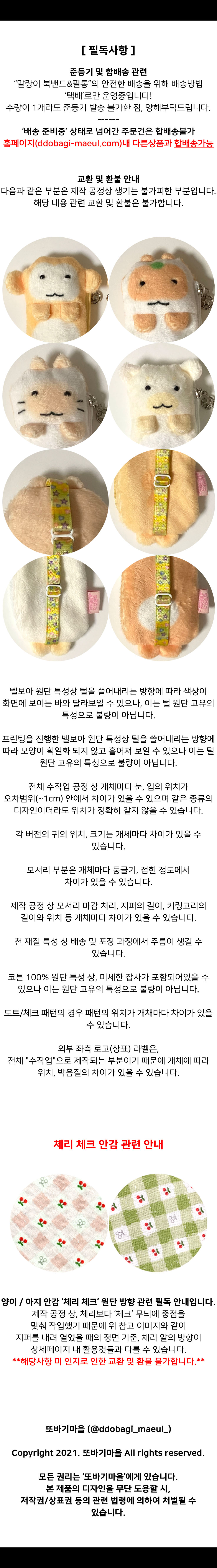- 1:1 주문 제작(예약 판매) 상품은 고객님 한 분 한 분의 주문 내용에 따라 재료(ex.원단, 부자재 등) 구입과 전체 수작업(핸드메이드)으로 진행되기 때문에, '주문 기간 종료' 후 단순 변심으로 인한 교환 및 반품이 불가합니다. / '주문 기간' 중에는 언제든 주문 취소가 가능합니다.