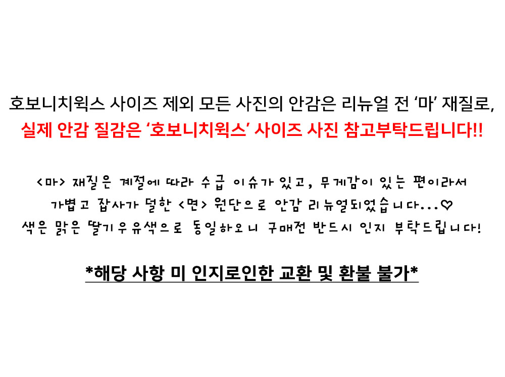 (๋ฌธ๊ตฌ์ ํ์ ํน์ฑ์ ์ฌํ๋งค๊ฐ ๋ถ๊ฐ๋ฅํ ์ํ(*๊ตฌ๊ฒจ์ง, ์ ํ์๊ตญ, ์ต์ด์ ํฌ์ฅ ํผ์ ๋ฑ)์ผ๊ฒฝ์ฐ ๋จ์๋ณ์ฌ์ผ๋ก ์ธํ ๊ตํ ๋ฐ ๋ฐํ ๋ถ๊ฐํฉ๋๋ค.)